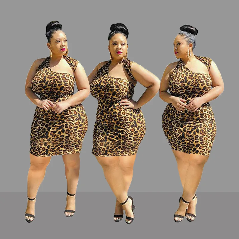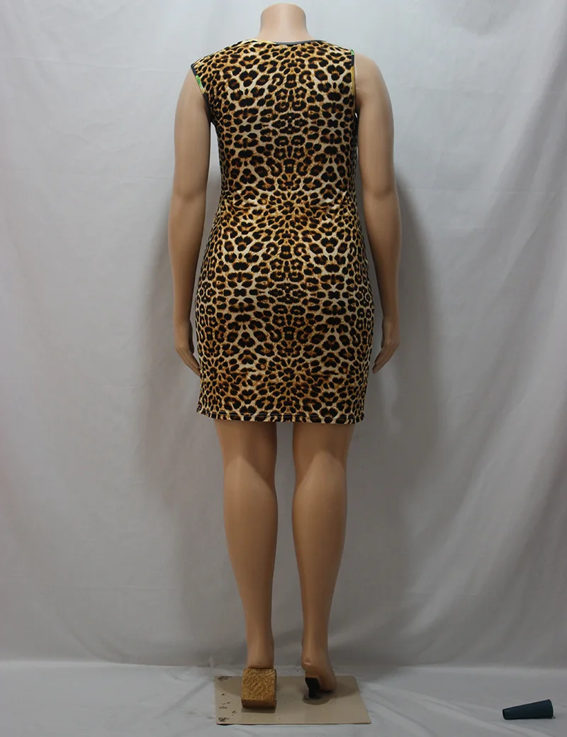 Sleeveless Knee-length Leopard Print Irregular Collar Sexy Plus-size Mini Dress